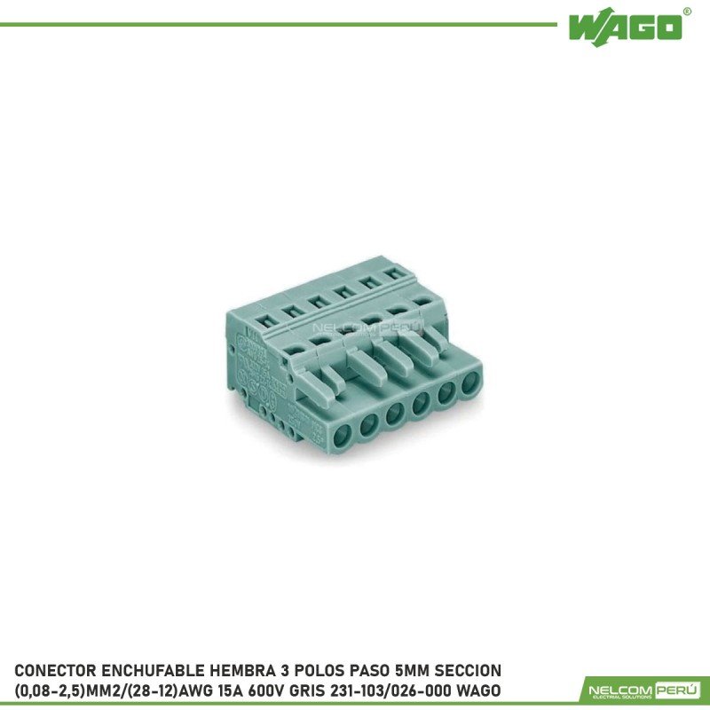 CONECTOR ENCHUFABLE HEMBRA 3 POLOS PASO 5MM SECCION (0,08-2,5)MM2/(28-12)AWG 15A 600V GRIS 231-103/026-000 WAGO